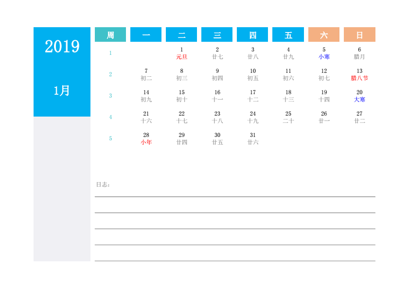 2019年台历全年表,模板B型,每月一页共12页,高清可打印免费下载pdf文档、word文档(可修改)。可选农历、周数、星期开始等多种组合,形成多种样式的台历供选择下载。